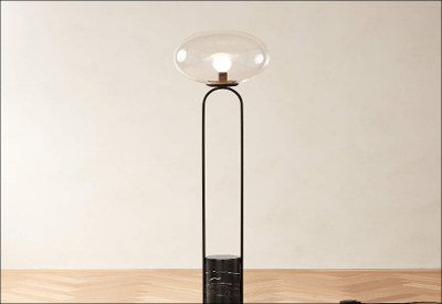 Striking floor lamp designed by VUUE centers on a base fabricated from polished silver dragon marble. Black with bold white veining, the stone is accented by a matte black iron frame that leads to an oval glass shade. Due to the nature of marble, each lamp will have a unique beauty. CB2 exclusive.